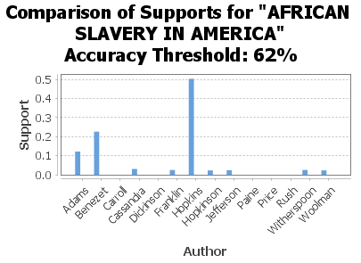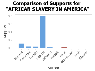 Here is the testing summary: The first several tests produced different author possibilities; this happens when the actual author is not present in the groups selected. So we searched for others, and Hopkins was the decisive winner in every test made with him included. (Note: a consistent 40% by one author against many groups is sufficient indication that that author is the most probable.)